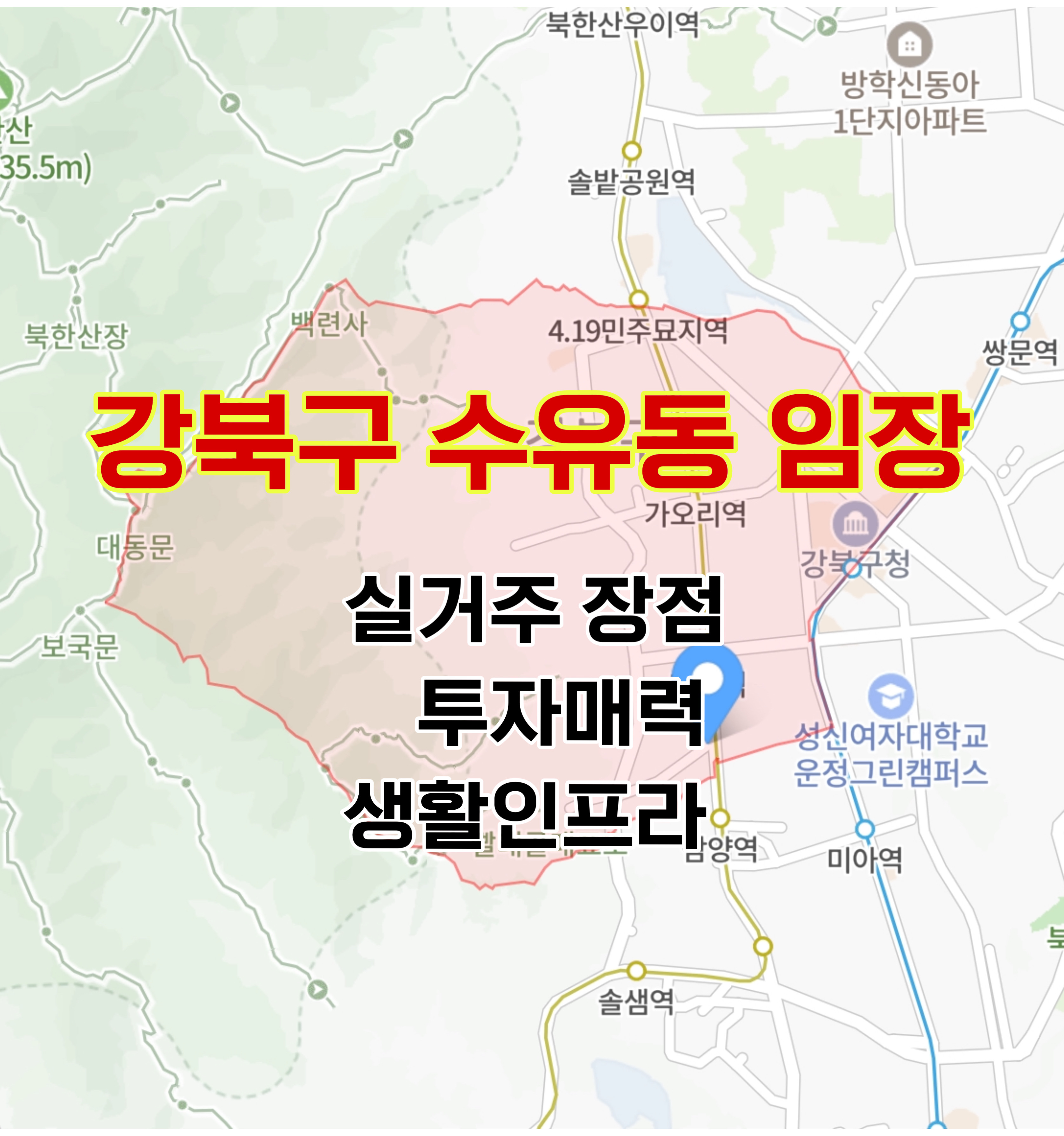 이처럼 수유동은 교통, 교육, 생활 편의시설, 자연환경이 조화를 이루는 지역으로, 실거주 및 투자에 적합한 지역입니다.
