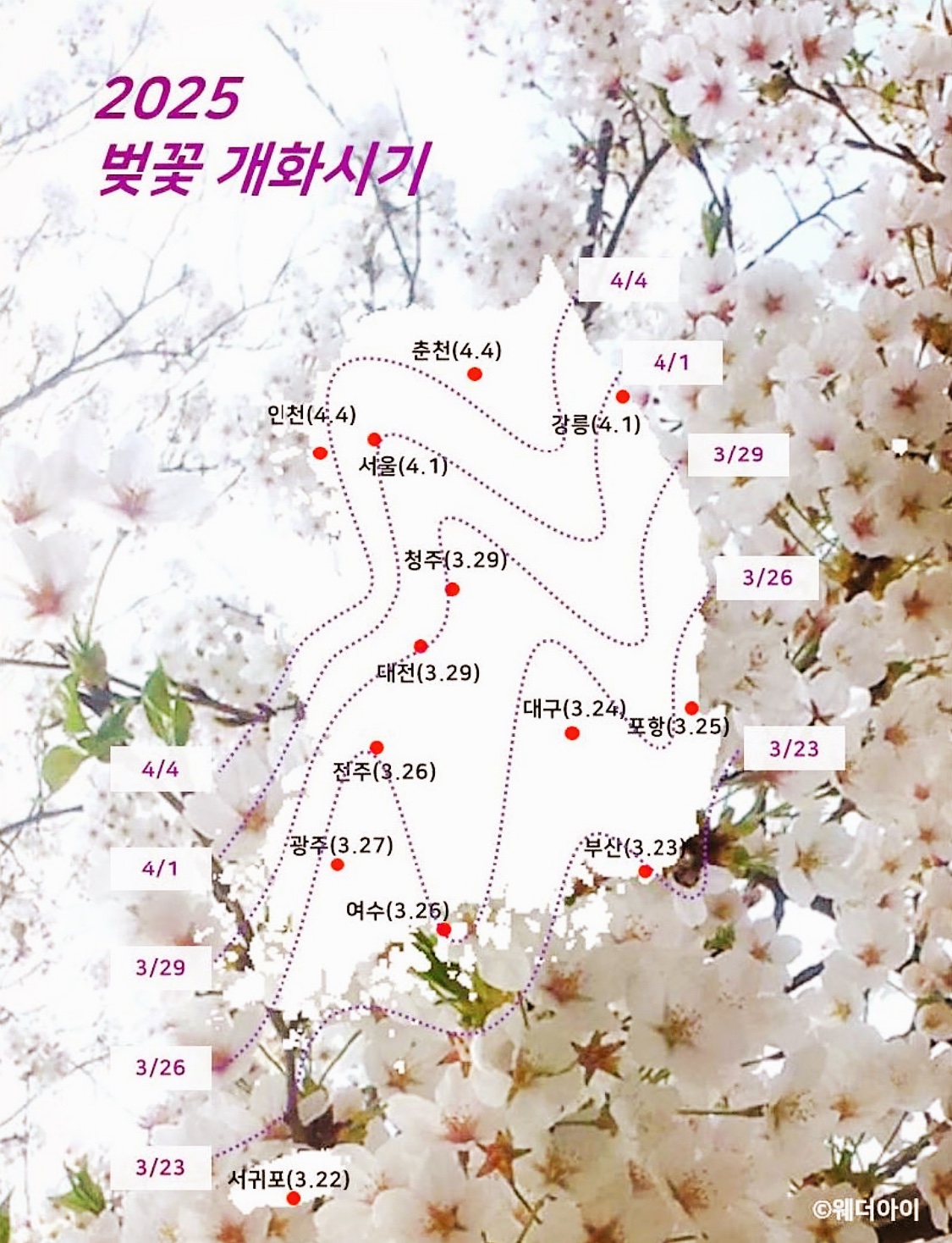 웨더 아이에서 발표한 이번 연도 벚꽃 개화시기는 서울기준 4월 1일 예정입니다.